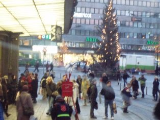 Kaiken kukkuraksi näiden kuvien aikaan törmäsin hyvään erittäin tunnustukselliseen luterilaiseen ystävääni, jonka kanssa vitsailimme kaikkien näiden lähetyssaarnaajien yhteiskäännyttämisestä;D Ai niin ja toisen tunnustuksellisen luterilaisen kaverini kanssa olen käynyt ”perinteisen” (toinen vuosi) joulukuisen vanhurskauttamisväittelyn, jonka voi lukea osoitteesta http://www.uskojarukous.net/phpBB2/viewtopic.php?t=1559, jos joku haluaa syventyä systemaattiseen teologiaan:) Asematunnelin ulkopuolella oli sitten pelastusarmeijan perinteinen joulukeräys ja taustalla kiva joulukuusi:
