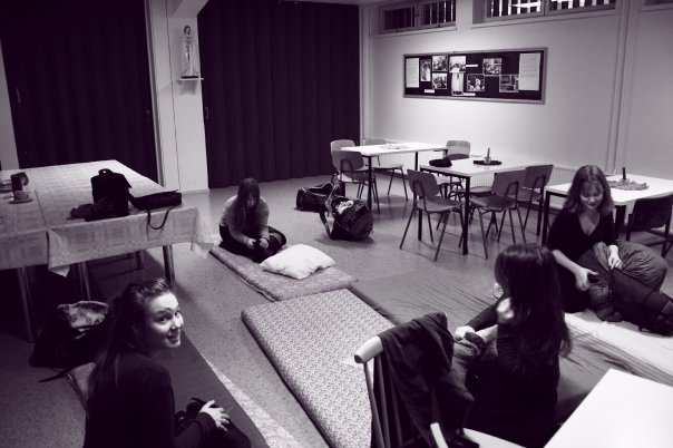 Sitten Tampereelle. Yllä p. Ristin kirkon seurakuntasalissa ollaan patjojen ja makuupussien kanssa – oli kuin yökoulussa konsanaan. Ohjelmaa oli kahtena päivänä, pe-la, ja porukka tuli tutuksi ja rakkaaksi siinä määrin, että kotiin palatessa oli jälleen jo ikävä. Mukana oli 10-15 ihmistä. Jotkut hurjastelijat menivät klo 3 yöllä lumisotaa ja heräsivät klo 6 tekemään aamupalaa tai rukoilemaan laudesta. Heihin kuului myös Iris…
