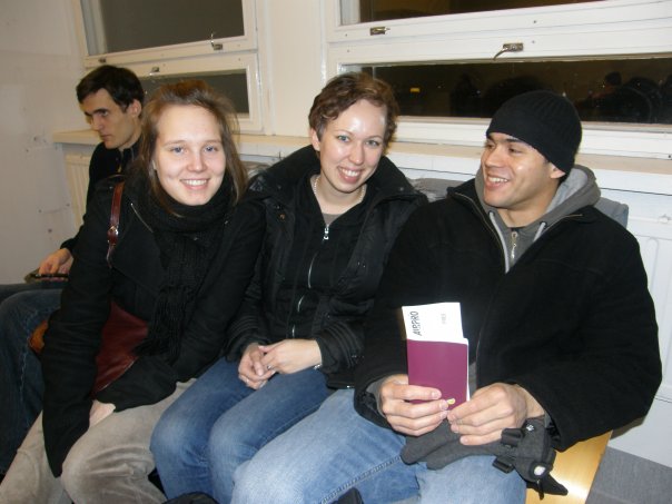 We traveled in 2 groups, one through Warsaw, the other via Gdansk. Here is the Gdansk group waiting for their flight (Martina, Saila, Jhoser) and then on the train to Poznan (Pasi, Mari, Martina), where they arrived at 3:25 a.m.! Yllä kuvissa ryhmä, jossa itse en ollut mukana, matkustaa Turusta koneella Gdanskiin (kuva alla) ja sieltä junalla Poznaniin, josta hain heidät isäntäperheiden poikien kanssa aamuyöllä. Polowa naszej grupy udala sie do Gdanska samolotem i stamtad do Poznania pociagiem.