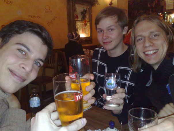 On the other hand, my half of our group traveled to Warsaw by Finnair. We had to wait a long time for the check-in and then hurry to the plane only to be informed that the flight will be over an hour late. Lentokentällä tunnelmat olivat korkealla ja jononpäät pitkällä. Lopulta oma ryhmänpuoliskoni pääsi Varsovaan, jossa ehdimme käydä vanhassakaupungissa oluella ennen junamatkaa kohti Poznanin asemaa (ks. kuva yllä). Ja i 3 chlopcy: Martti, Joni i Jesse pojechalismy do Poznania przez Warszawe, gdzie tez mielismy okazje zwiedzic stare miasto i jesc pierogi na obiad.