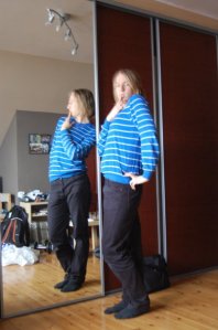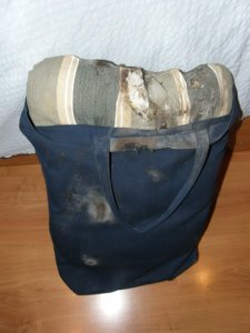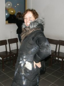 After having the girls sit on our laps on the way home (10 people in a car of 7), we had an evening snack and headed to the parish, where Saila had to suffer the consequences of the fireworks. Kotona saimme maistaa perinteisiä puolalaisia uudenvuodenmunkkeja (ja hyviä olivatkin!). Keskiyöllä Saila sai vielä maistaa ilotulitusten tulta oikein henkilökohtaisesti. Tak wygladaly kurtka i torba Saili po polnocy: